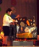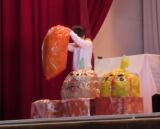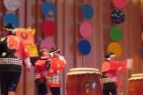 1年生から3年生は、「やさいさん~カレーライスをつくろう~」というテーマで発表を行いました。1年生は畑を耕して野菜を植え、みんなで水やりをして大きな野菜を作りました。2年生は美味しそうに育った野菜を「すっぽーん」と抜きました。3年生は、大きなお鍋に野菜とカレールーを入れて、お玉でまぜまぜ。みんなで協力して美味しいカレーができました。最後は、1年生から3年生がステージに集まり、いただきますの歌を歌ってお祝いしました。