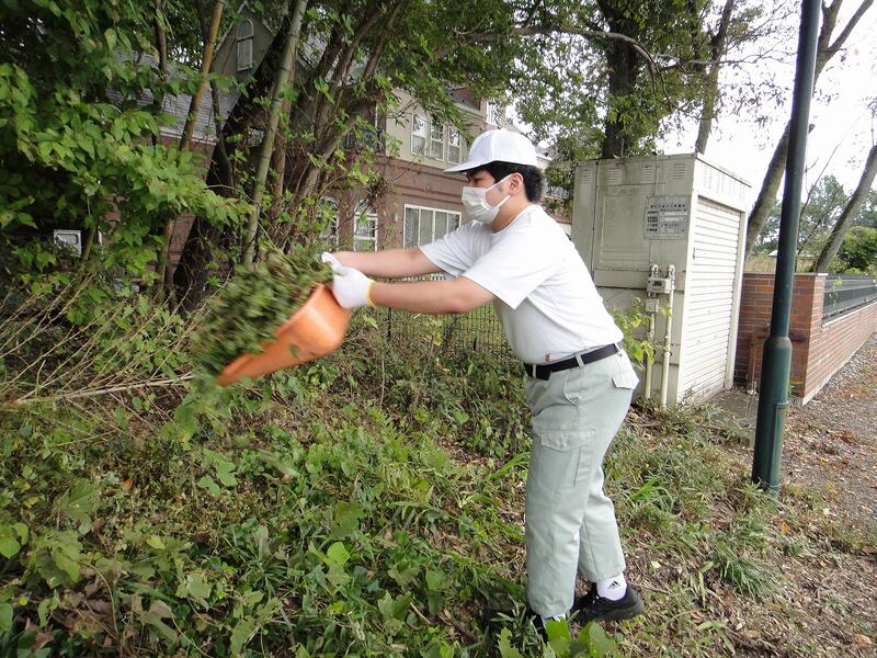 当日は、入口近くや駐車場の植え込み周りの除草等をさせていただきました。施設の職員の方にご挨拶をいただき、生徒たちはより意気込んで活動に取り組んでいました。植え込みのつる状の草をとるのに苦戦する様子もありましたが、次第に手際よく取れるようになりました。