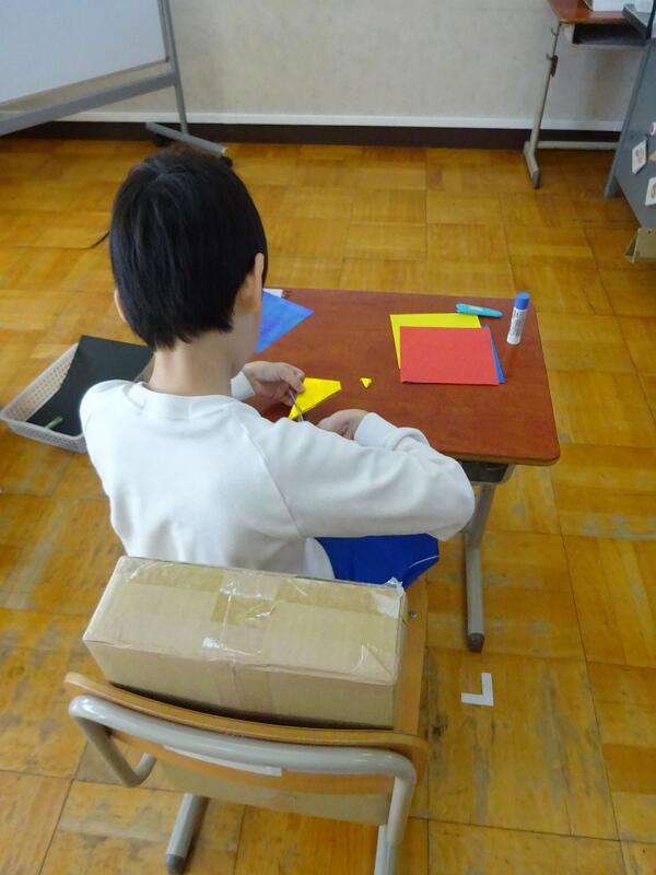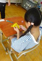 切り絵の制作では、折り紙を何回か折った後にはさみで切れ込みを入れました。