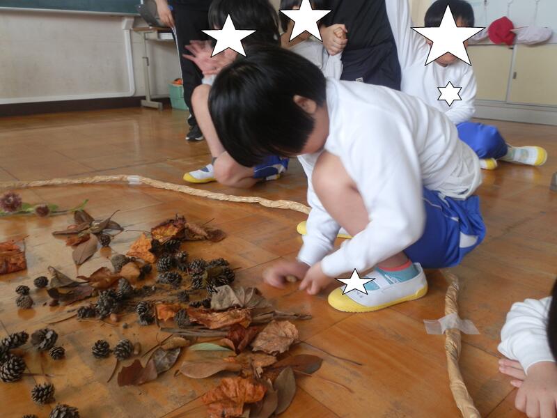 本物の松ぼっくりや葉っぱ、サツマイモ、栗などに友達と一緒に触れる時間が楽しかったようで、会話が弾んでいました。