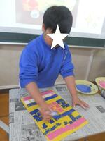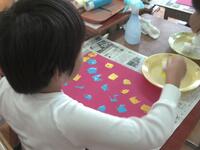 バスの制作では、スポンジに絵の具を付け、画用紙にスタンプして模様をつけました。