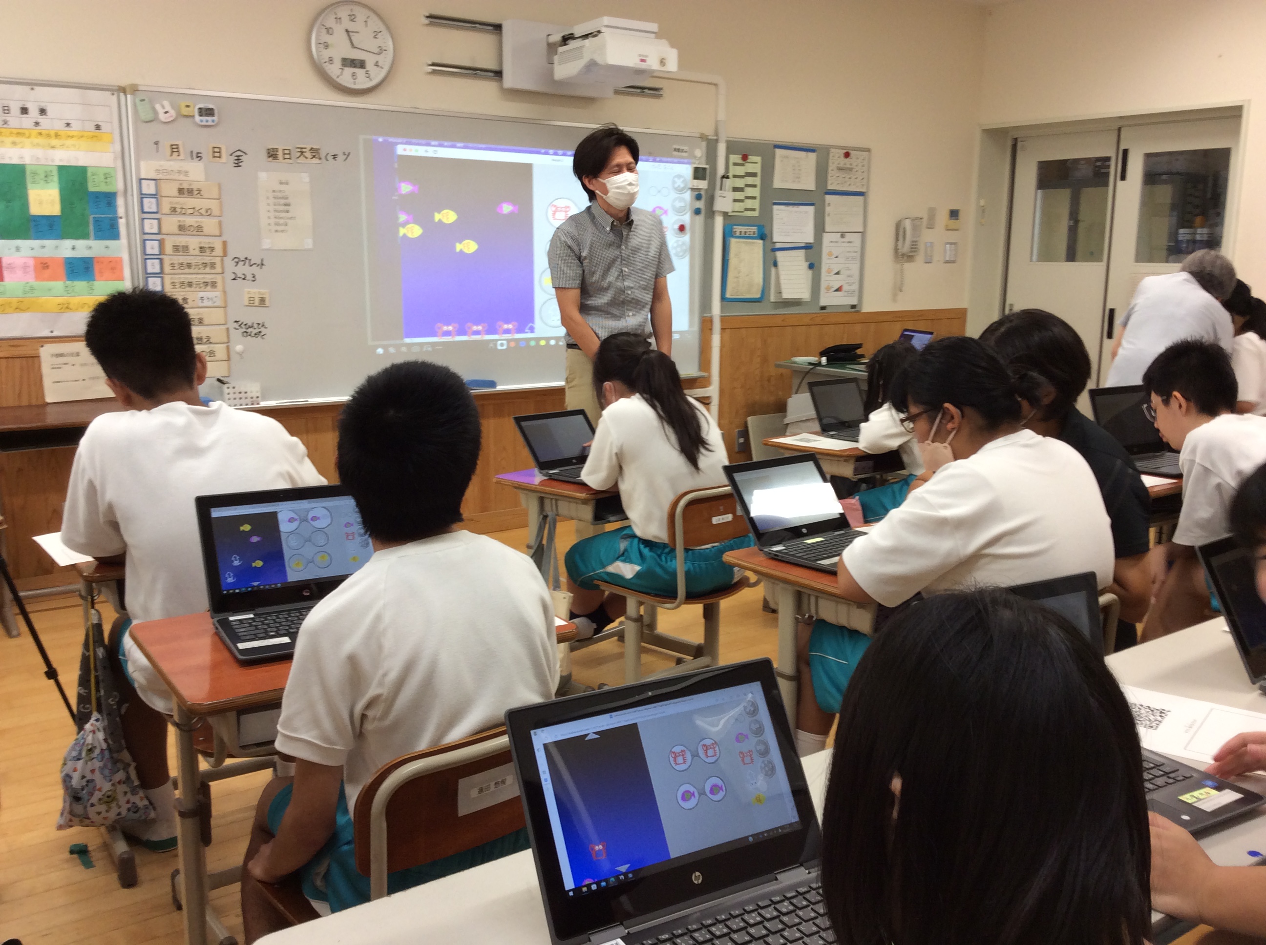 プログラミングアプリの基本的な操作の仕方を練習した後、海の生き物をテーマに自分で絵を描き、動き方のプログラムを作りました。それぞれが画面上に描いた海の生き物を共有して、みんなで「水族館」を作りました。生徒、教員共に、一緒に楽しく学んだ時間でした。