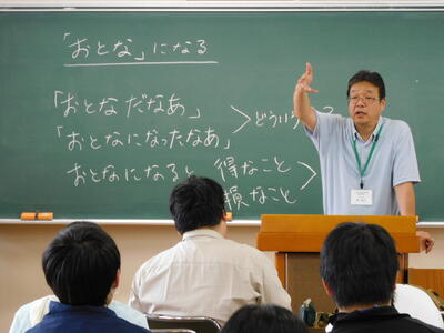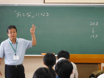 『おとなになる』をテーマに、最近大人になったと感じたことや、大人と子どもの違いなど自由に考えを出し合いました。大人は車の運転や一人暮らしができるので楽しいという意見や、反対に仕事などで責任が増えるから大変だという意見も出て、生徒たちは多くの考えを共有することができました。