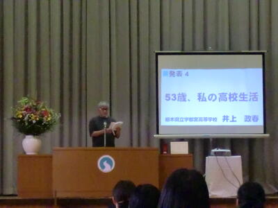 10月4日(土) 新潟県立翠江(すいこう)高等学校にて開催された、関東地区高等学校通信制教育研究会生活体験発表会において、本校からは、井上政春さん(25C)が参加し、「53歳、私の高校生活」の題で発表しました。発表スキルと発表内容等により審査が行われた結果、「優良賞」となり、惜しくも全国大会への出場権は逃しました。しかし、発表内容が大変優れており、聴衆の心を動かした内容であったことから、審査員の総意により「審査員特別賞」が送られました。勇気を出しで応募したことで、自らの成長につながりました。そして、大きな成果も得ることができました。