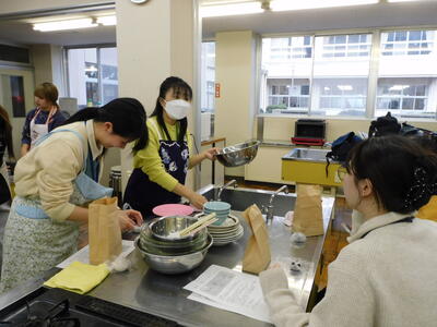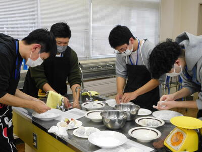 フルーツ大福づくりでは、いちご、キウイ、マスカット、みかんをあんこで包み、白玉粉から皮をつくって完成させるという一連の流れを体験しました。皮の材料を混ぜる前は、「本当に固まるの?」と疑問に思っていた生徒も、電子レンジで温め、手で混ぜると徐々に大福の形になってきたのを見て驚いた様子でした。