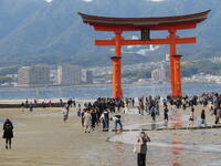 宮島ではたくさんの鹿がいて、とても人に慣れているようでした。また、ちょうど干潮の時間だったので鳥居の先まで潮が引いており、鳥居まで歩いて行くことができました。