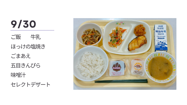 今日の主菜は、ほっけの塩焼きです。香ばしく焼いたほっけに大根おろしを添えました。副菜の五目きんぴらには、ごぼうやれんこん、にんじんなどの野菜に加えて、ちりめんじゃこも入っているのでカルシウムもしっかり摂れます。デザートはセレクトで、焼プリンタルトとチョコタルトの2種類から選んでもらいました。どちらも同じくらい人気で、嬉しそうに選んでいる生徒の姿が見られました。