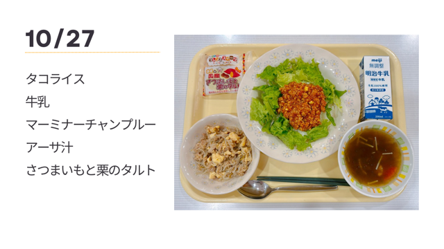 10月27日の給食 投稿日時 : 10/28 給食部 今日の主食は、生徒からのリクエストでタコライスです。ご飯の上に、ケチャップやピザソースを加えた甘辛い味付けのタコミート、レタスをのせました。タコライスは沖縄発祥の料理で、今日も大人気でした!副菜のマーミナーチャンプルーは、もやしとさまざまな具材を炒め合わせた沖縄の家庭料理の一つです。マーミナーとは、沖縄の方言でもやしのことです。 Tweet {{options.likeCount}} {{options.likeCount}} 0 コメント