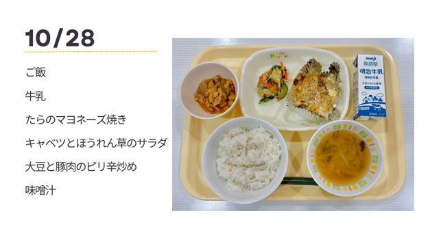 10月28日の給食 投稿日時 : 10/29 給食部 今日の主菜は、たらのマヨネーズ焼きです。下味をつけたたらに、たまねぎとしめじをマヨネーズであえたものをのせて、パン粉・粉チーズ・パセリをかけてこんがりと焼き上げました。香ばしさとやさしい味わいを楽しめる一品です。たらは身がふっくらとしていて脂肪が少なく、たんぱく質が豊富な食材です。 Tweet {{options.likeCount}} {{options.likeCount}} 0 コメント