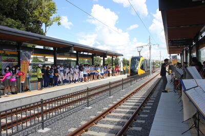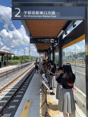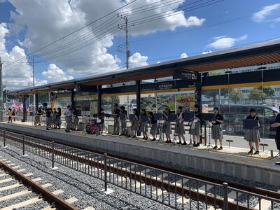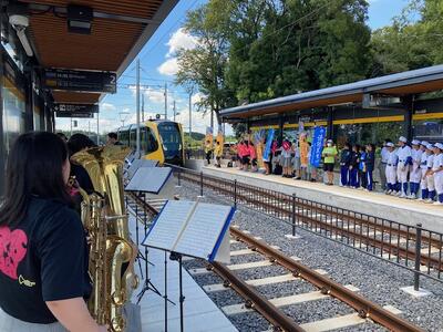 さて、8月26日(土)にLRTが開通し、一番列車が「清陵高校前」停留所を通過するタイミングで歓迎演奏を行わせていただきました。ガーデンコンサートで慣れている部員も、初めての場所での演奏に緊張している様子でしたが、とてもゆっくりと通過していくLRTに向かって、精一杯の演奏で歓迎し、反対側のホームにいた本校生や作新学院大学の皆様、ボランティアの方にも大きな拍手をいただきました。なかなかできない経験ですので、部員も良い思い出になったようです。今週末は清陵祭での演奏が控えています。3年生はラストステージとなります。最後まで部員一同、笑顔で真剣に取り組んでまいります。今後ともよろしくお願いいたします。