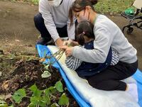 苗づくりからはじめたさつまいもを収穫しました。葉やつるの成長が思わしくなかったので心配していましたが、予想以上にしっかりとしたさつまいもが育っており、無事に収穫することができました。当日、子どもたちは一生懸命つるを引っ張り、土の中から顔を出すさつまいもにびっくりしたり、笑顔を見せたりして、楽しく収穫体験をしました。