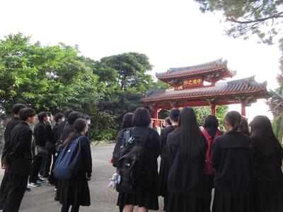首里城は数年前の火災の影響で復旧工事が進められています。そのため、見られる部分は限られていましたが、首里城の赤い屋根や高台から見える街並みを生徒たちは興味深そうに見学していました。