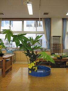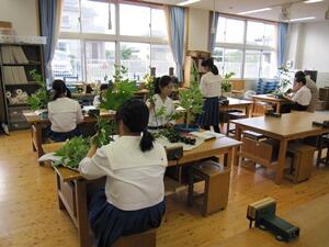 こんにちは。華道部です。私たち華道部は毎週水曜日に、顧問の先生と外部講師(龍生派)の先生の御指導の下、工芸室で附属中の伝統文化部と一緒に活動しています。3年間活動を続けるとお免状を取得することができますので、それに恥じぬよう本格的に活動しています。