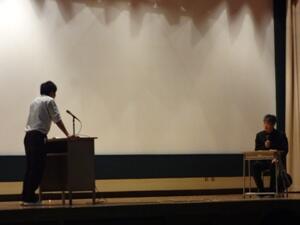 実行委員が制作したビデオを上映し、その最後に実行委員がステージ上でクラッカーをならし、ポーズをとって華々しく矢東祭がスタートしました。その後、実行委員と校長先生によるショートコントが行われ、ホームルームの風景を題材にしたコントで会場は歓声につつまれました。