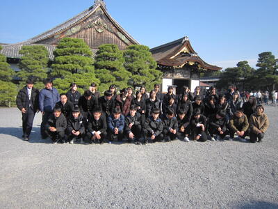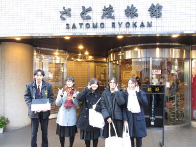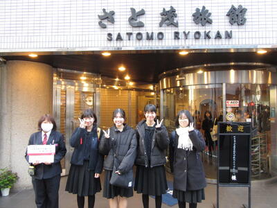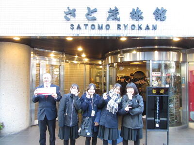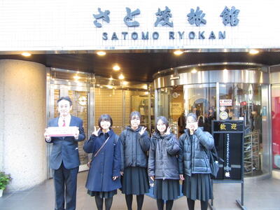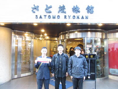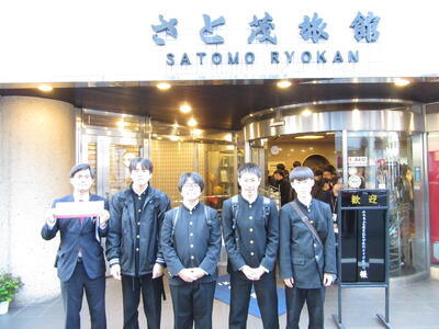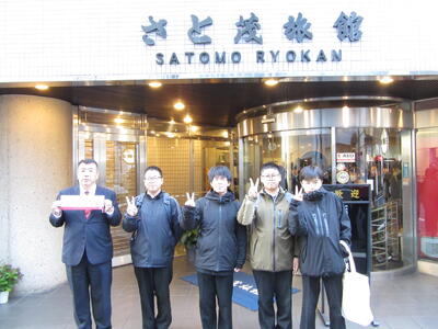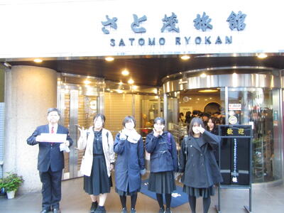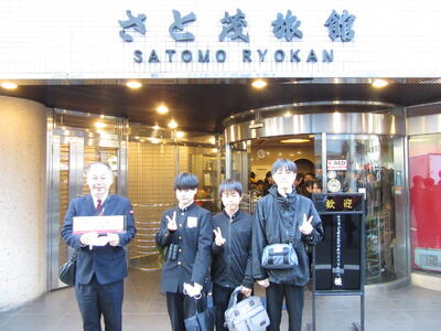 班ごとに立てた計画に沿って、各地を見学します。宿の前で記念写真を撮って、出発です。